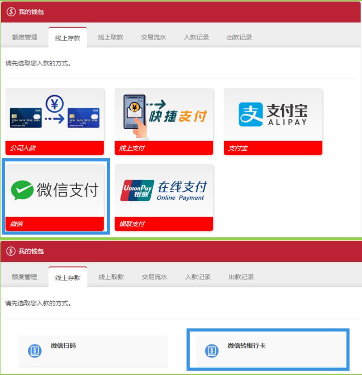 电脑用户点击右上角登入,登入会员账号,点击屏幕右上方的线上存款。再点击微信,选择微信转银行卡