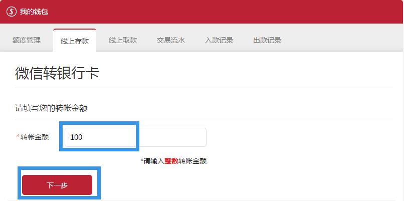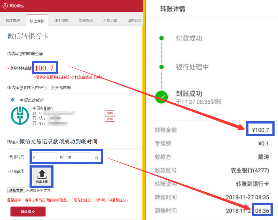 查看系统生成带有小数点的金额,记录好公司收款银行账户,使用微信进行转账(转账金额务必与带有小数点的金额一致);到账成功后按照提示填写到账时间,并上传您的转账详情截图,在点击确认提交(温馨提示:使用微信转账至平安银行是即时到账的; 务必先确认到账后,填写准确到账时间,再点击提交,否则财务人员查询不到款项无法第一时间帮您添加额度。)